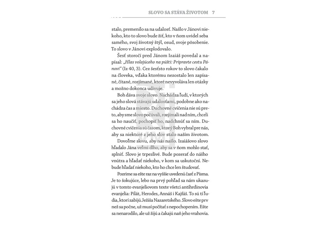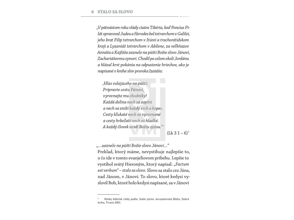 Kniha vznikla z adventnej duchovnej obnovy, ktorej téma bola Slovo sa stalo telom. Hovorí o Božom slove, ktoré sa uskutočňuje v každom z nás a na ktoré môžeme odpovedať vierou. Je rozprávaním o nádejí, ktorú nám Boh ponúka v Kristovi. Každému sa Boh dáva poznať pod menom „Ja Som“.
