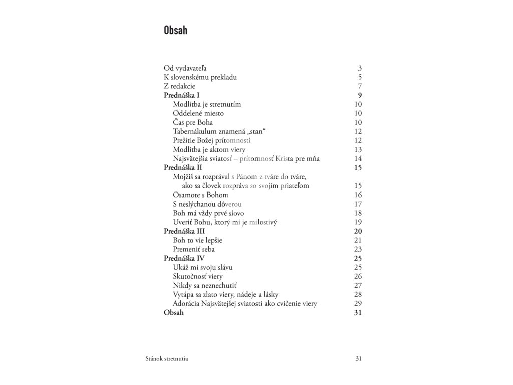 Útla brožúrka z pera otca Františka Blachnického zo série Školy modlitby. Brožúrku tvoria 4 prednášky o osobnej modlitbe. Osobná modlitba, modlitba, ktorá tvorí základ kresťanského života. Je to zvláštny čas stretnutia, prebývania „osamote s Bohom.“ Tieto štyri prednášky sú rozjímaním nad biblickým textom o modlitbe, ktorý opisuje modlitbu Mojžiša v stánku stretnutia (Ex 33, 7 – 20).
