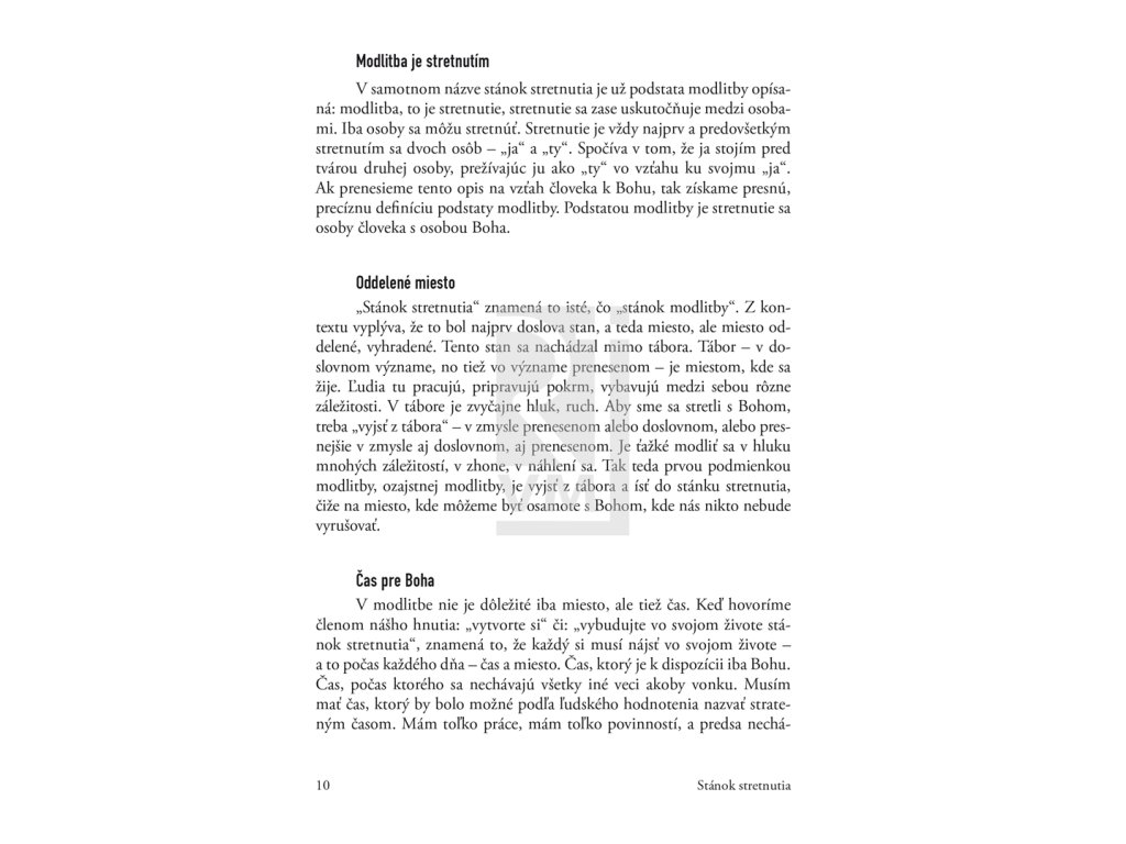 Ako hovorí autor: „K tomuto textu sa musíme stále vracať, až kým nepochopíme celú hĺbku modlitby.“ Jej každodenné, osobné praktizovanie nazýva Stánok stretnutia.