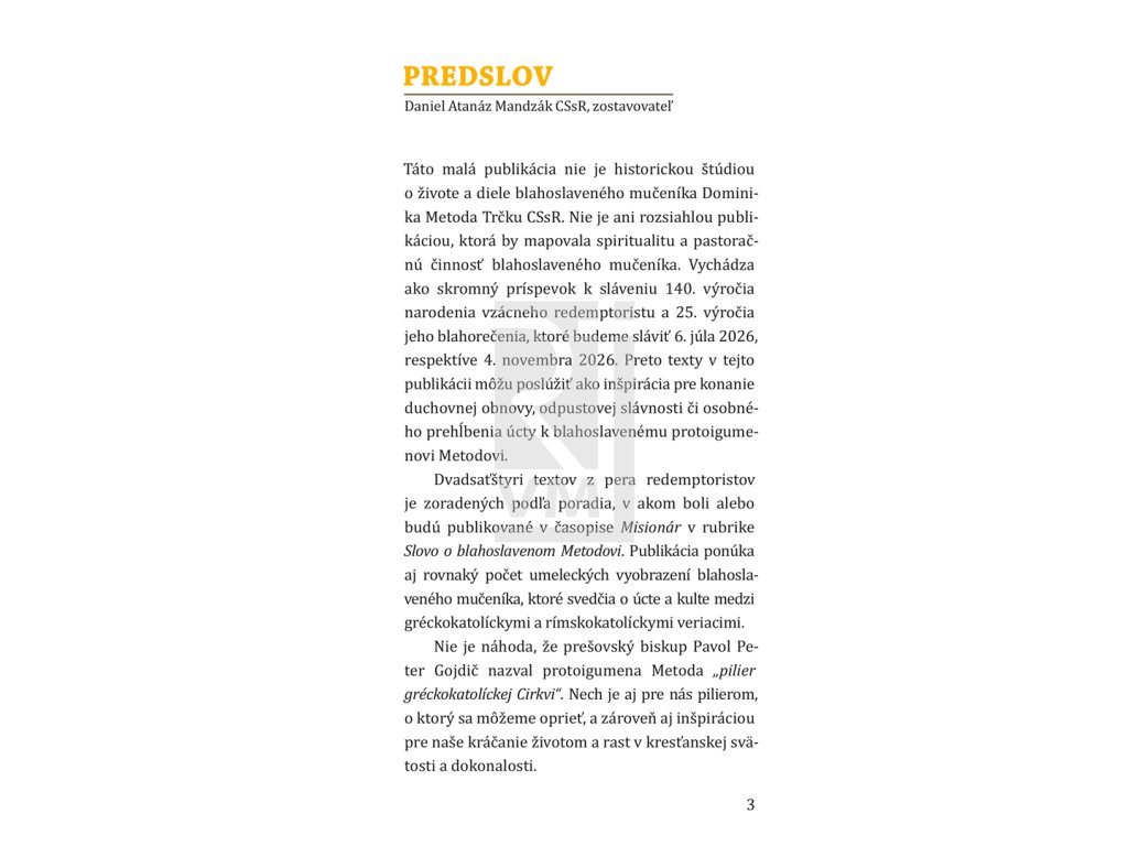 Publikácia vychádza ako skromný príspevok k sláveniu 140. výročia narodenia vzácneho redemptoristu a 25. výročia jeho blahorečenia, ktoré budeme sláviť 6. júla 2026, respektíve 4. novembra 2026. Preto texty v tejto publikácii môžu poslúžiť ako inšpirácia pre konanie duchovnej obnovy, odpustovej slávnosti či osobného prehĺbenia úcty k blahoslavenému protoigumenovi Dominikovi Metodovi Trčkovi.